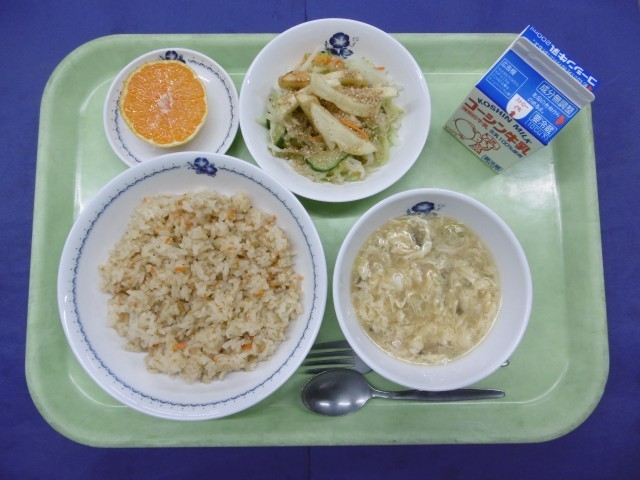 きょうのこんだては、ツナピラフ、揚げじゃがサラダ、豆腐と卵のスープ、果物(みかん)、牛乳です。