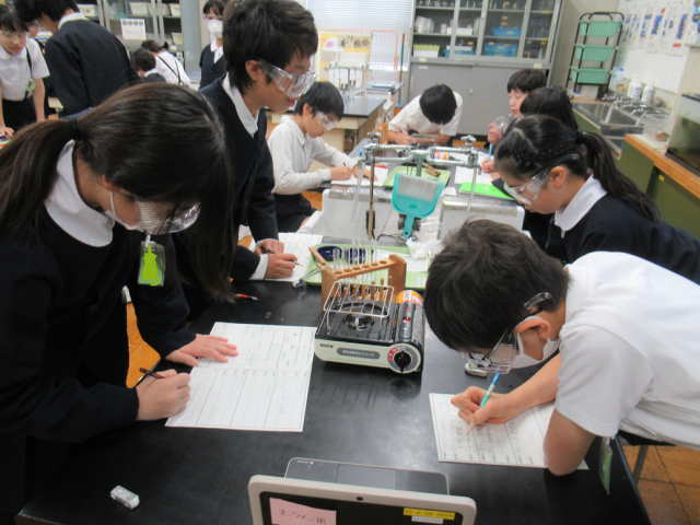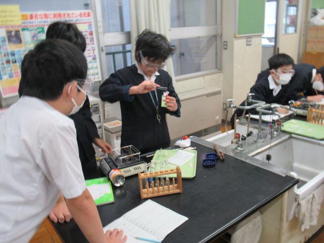 理科の授業で水溶液について学習しました。5つの水溶液の性質を学び、単元の最後にはその性質を生かして、名前の分からない水溶液の名前を実験を通して確かめる実験を行いました。班で協力して実験計画を立て、順序立てて実験を行い、すべての班が水溶液の名前を当てることができました。危険な薬品も扱いましたが、落ち着いて学習する様子が見られ、科学の楽しさを味わうことができました。