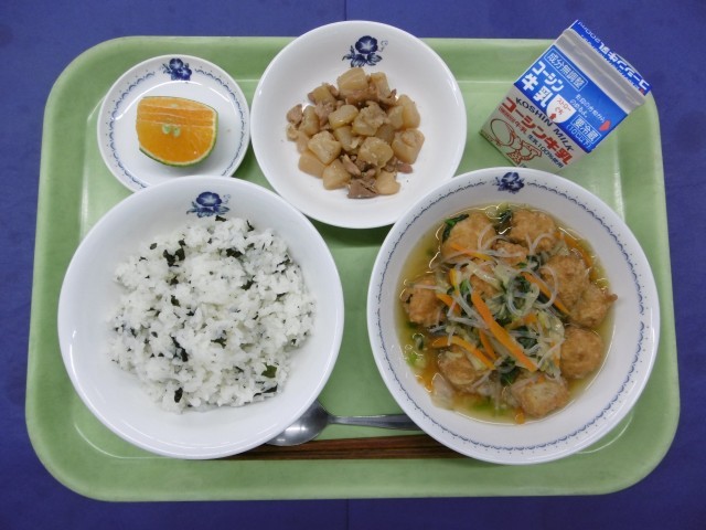 きょうのこんだては、・わかめごはん・豆腐団子の春雨煮こみ・こんにゃくのごま煮・果物(早香)・牛乳です。