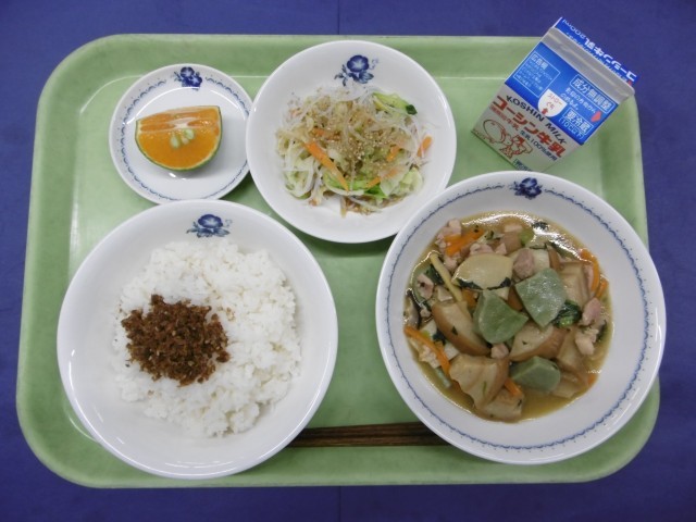 きょうのこんだては、・ごはん/かつおふりかけ・治部煮・春雨サラダ・果物(早香)・牛乳です。