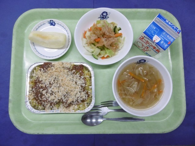 きょうのこんだては、・メキシカンドリア・れんこんのパリパリサラダ・ジュリアンスープ・果物(りんご)・牛乳です。
