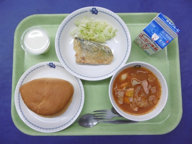 きょうのこんだては、さばサンド、ミネストローネ、サワーゼリー、牛乳です。