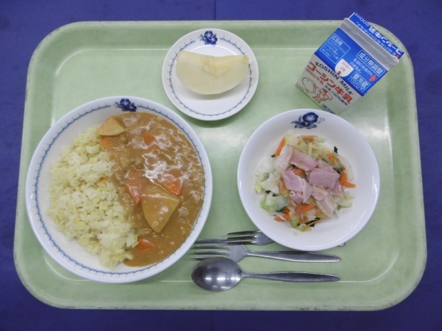 きょうのこんだては、バターチキンカレー、果物(りんご)、カリカリベーコンサラダ、牛乳です。