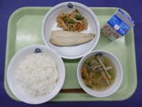 きょうのこんだては、バジルコーンピラフ、スパイシーポテト、てぼ豆のトマトスープ、牛乳です。