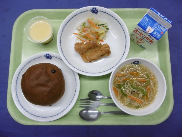 きょうのこんだては、チョコチップパン、アップルドレッシングサラダ、フライドチキン、パスタ入りスープ、カスタードプリン、牛乳です。