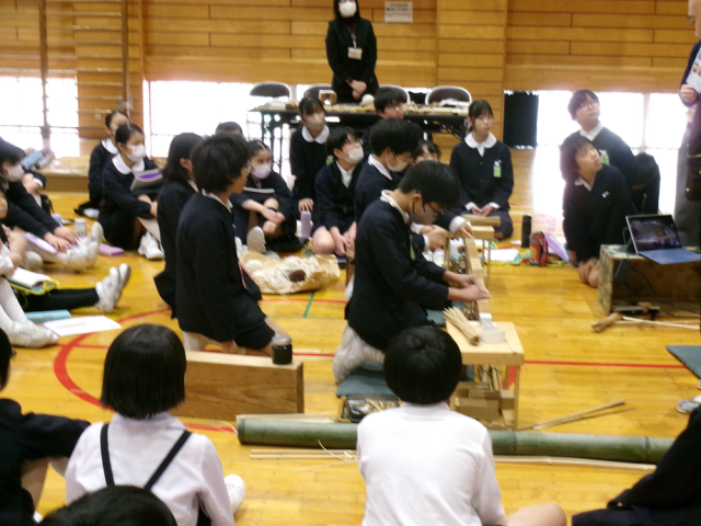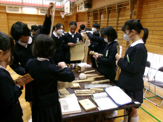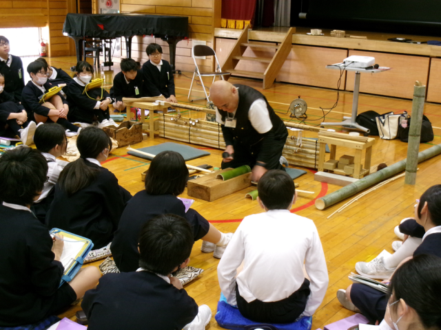 簾職人の田中耕太朗様に来ていただき、伝統工芸教室を実施いたしました。伝統工芸とは何か、文化とは何かをお話しいただき、簾を作る作業を見せていただきました。そして実際に簾を作る作業を体験させていただきました。質問コーナーでも多くの質問に答えていただき「職人になるには、どのような気概が必要ですか?」や「簾を作る上で大変なことは何ですか?」等の質問に親身に答えていただきました。6年生は2学期の多くの出前授業を経験しましたが、どの内容にも通じる伝統文化に対する考え方を教えていただきくことができ、大変有意義な時間となりました。