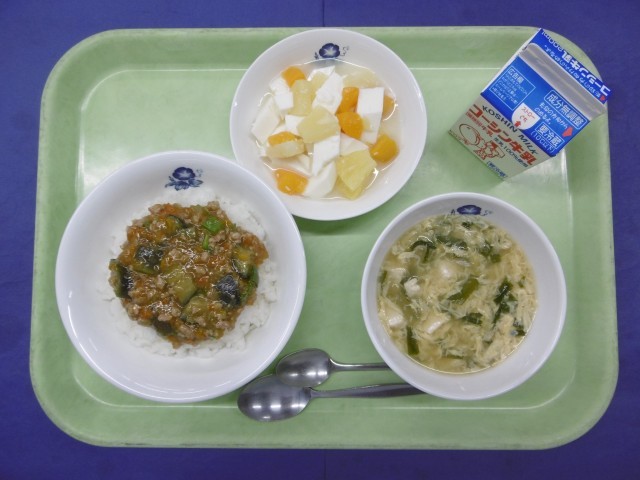 きょうのこんだては、野菜たっぷりルーローハン、にらたまスープ、杏仁豆腐、牛乳です。