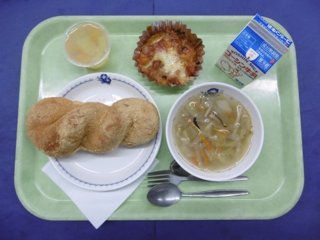 きょうのこんだては、・牛乳・きな粉揚げパン・ピザポテト・白菜スープ・フルーツ入りサイダーゼリーです。