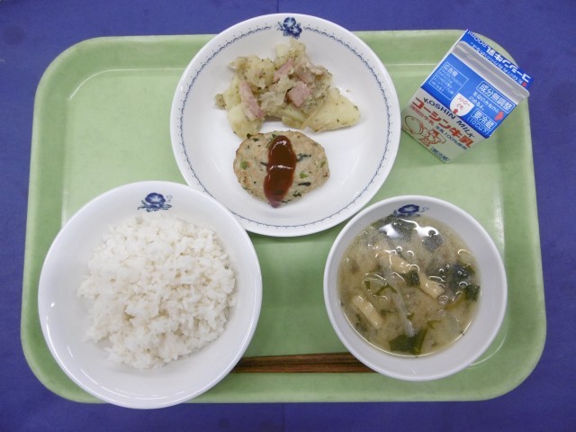 きょうのこんだては、・麦ごはん・小松菜ハンバーグ・ジャーマンポテト・みそ汁・牛乳です。
