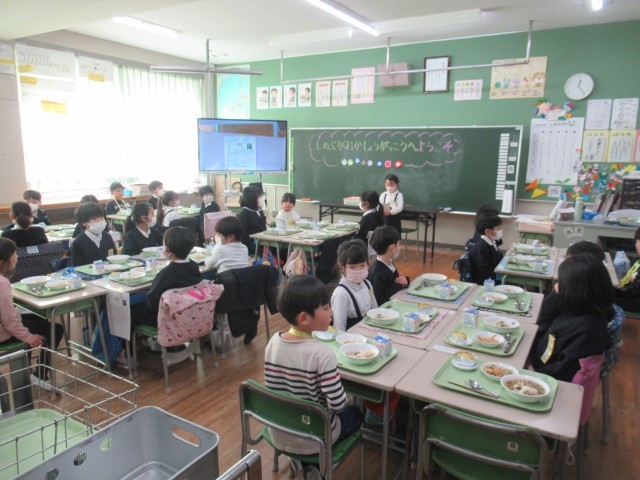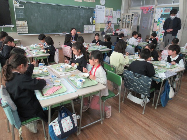 1年生が忍岡こども園の年長さんとふれあい会食会を行いました。