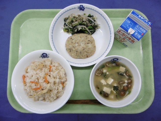 きょうのこんだては、こぎつねごはん、魚のさんが焼き(千葉県の郷土料理)、野菜のごま酢和え、なめこ汁、牛乳です。