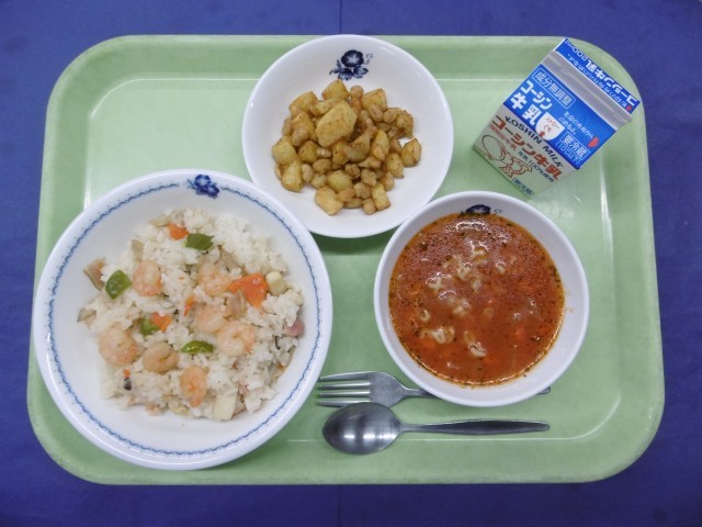 きょうのこんだては、シーフードピラフ、スパイシーポテトビーンズ、ABCスープ、牛乳です。
