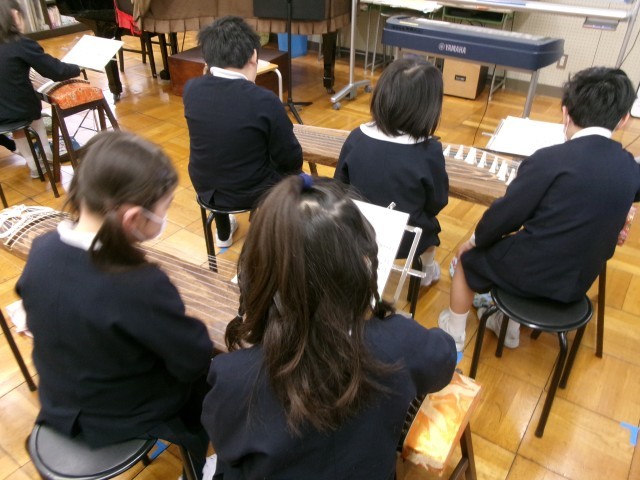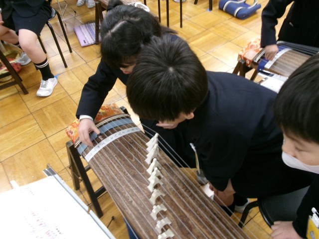 2年生の音楽では、「こぐまの二月」の旋律を箏で演奏しました。爪のはめ方や、音の鳴らし方を確認しながら、一音一音を大切に弾くことを意識して練習しました。箏の魅力を改めて感じる時間となりました。