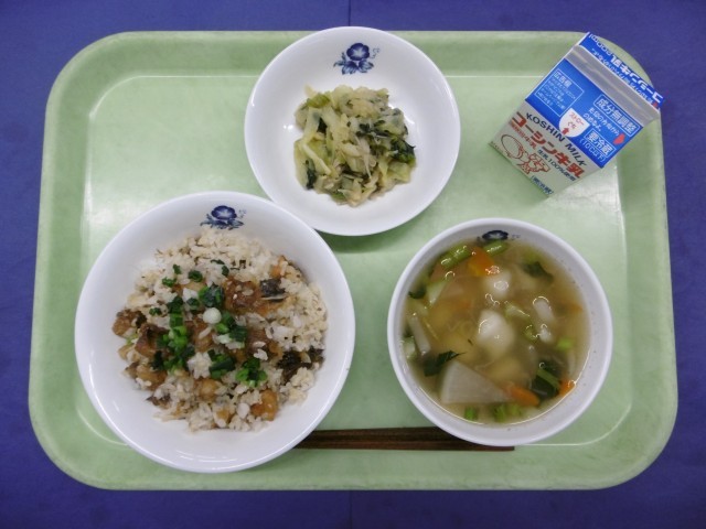 きょうのこんだては、いわしのひつまぶし、おろし煮びたし、いも団子汁、牛乳です。