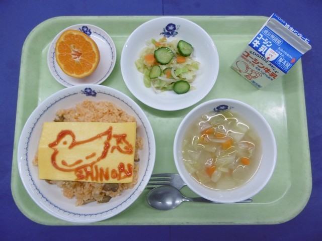 今日の献立は、・オムライス・コンカッセスープ・レモンドレッシングサラダ  ・果物(ポンカン)・牛乳です。