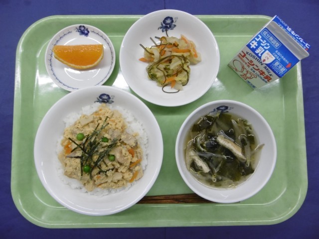 きょうのこんだては、・親子丼・白菜のおひたしゆず風味・みそ汁・果物(デコポン)・牛乳です。