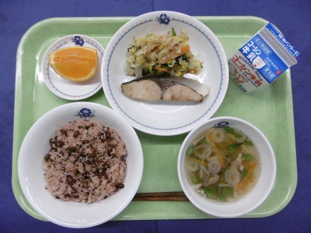 きょうのこんだては、・お赤飯・魚の照り焼き・野菜の五色和え・沢煮椀・果物(清見オレンジ)・牛乳です。