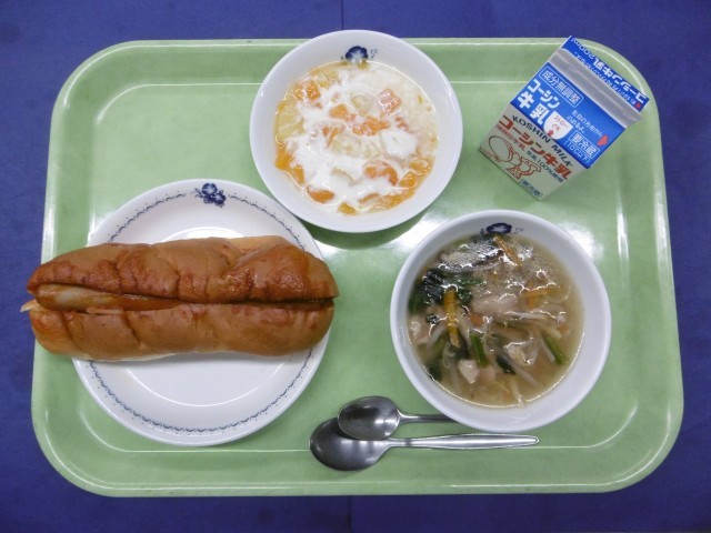 『ホットドッグ』は、パンに具をはさむサンドイッチの一種です。炒めたキャベツとボイルしたウインナーをパンにはさみ、オーブンで焼きました。スープには、鶏肉とたくさんの野菜を入れました。栄養もたっぷりで、体があたたまります。デザートは、ヨーグルトにみかん・パイン・ももを入れた『フルーツヨーグルト』です。学校の給食は、みなさんの成長に必要な栄養がたくさん含まれています。