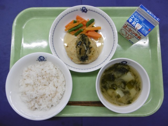 きょうのこんだては、・麦ごはん・和風ハンバーグおろしソース・みそ汁・人参といんげんのソテー・牛乳です。
