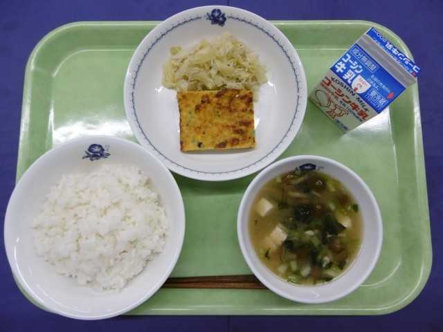 きょうのこんだては、・ごはん・千草焼き・春キャベツとしらす炒め・なめこ汁・牛乳です。
