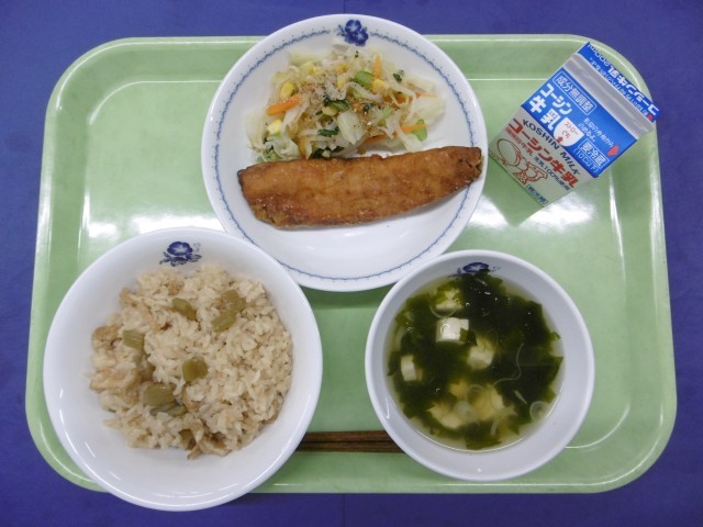 きょうのこんだては、・ふきごはん・魚の竜田揚げ・野菜の五色和え・すまし汁・牛乳です。