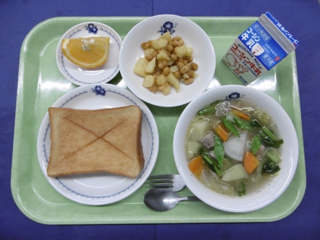 きょうのこんだては、・シナモントースト・春野菜のポトフ・カレービーンズ・果物(甘夏みかん)・牛乳です。