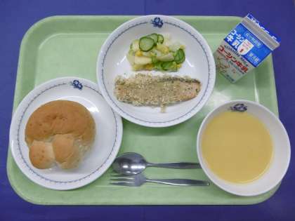 今日の給食は,セサミパン、魚のハーブパン粉焼き、アップルコーンサラダ、さつま芋と南瓜のポタージュ、牛乳でした。