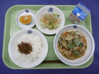 今日のこんだては、スパゲティナポリタン、ハニードレッシングサラダ、黒ごまゼリー、牛乳です。