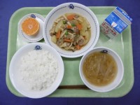 きょうのこんだては、たこめし、季節野菜のごまだれ、田舎汁、果物(クインシーメロン)、牛乳です。