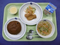 きょうのこんだては、ごはん、あじのメンチカツ、きのこ入りおひたし、スキー汁、牛乳です。