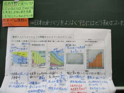 お米の生産量や消費量、米農家に携わる人の推移を表したグラフを見ながら、現在の日本の問題点とその解決策を話し合いました。