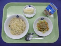 きょうのこんだては、ごはん、魚の竜田揚げ、野菜のいそ和え、せんべい汁、果物(青...