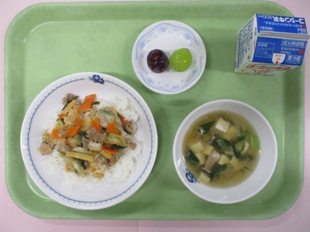 献立は、ホイコーロー丼、中華スープ、食べくらべぶどう、牛乳 です。