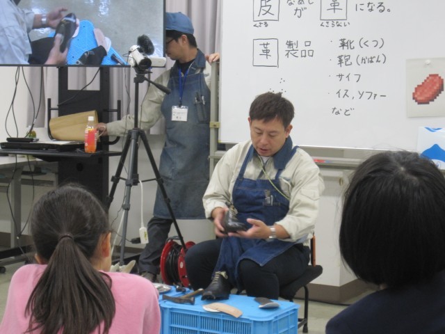 都立城東職業能力開発センターでは、靴を作る工程や、実際に靴に使われている革を見せてくださいました。昔の草履から鮭の皮でできた靴も展示してあり、驚いている児童もいました。