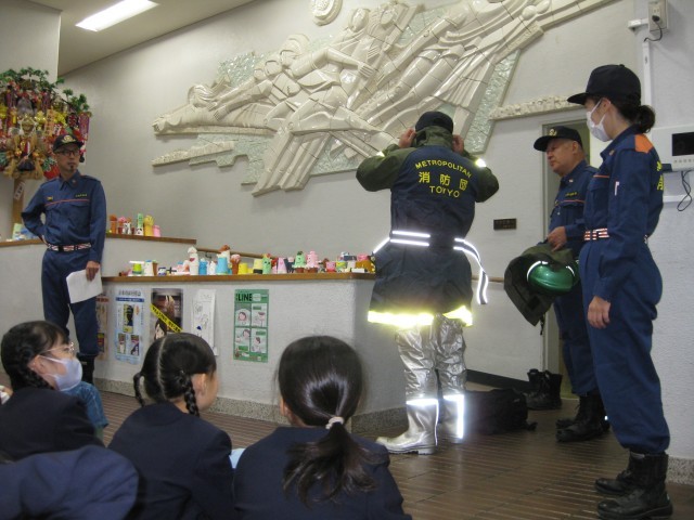 消防団の方は、町会長さんやおせんべい屋さん、看護師さんなどの仕事をしながら、谷中の町の災害を守る仕事をしていることに驚いた児童がたくさんいました。
