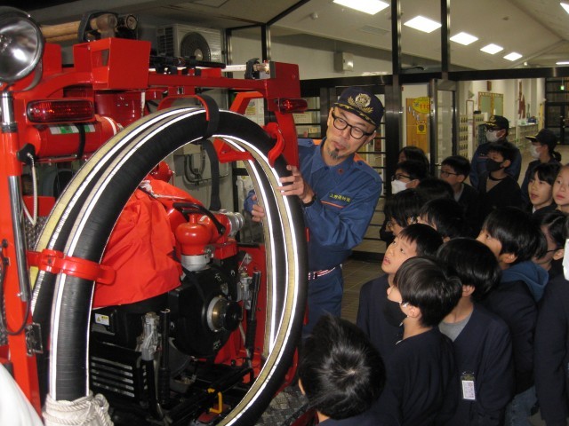 消防団の仕事について詳しく説明していただいたり、実際に使っている消防車の設備や緊急時に着る服を身に着ける様子をお話ししていただいたりしました。