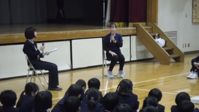 11月28日(金)元体操日本代表選手の宮川紗江さんが、谷中小学校を訪れました。宮川さんは、リオデジャネイロオリンピックの時の日本代表選手です。