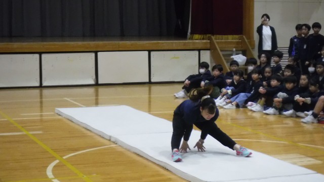 2校時は、全校児童の前で色々なお話や質問に答えてくださり、体育館中央で実技も披露してくださいました。一つ一つの技の完成度が素晴らしく、子供たちも興奮気味に観ていました。最後は、全校で記念撮影をして終わりました。