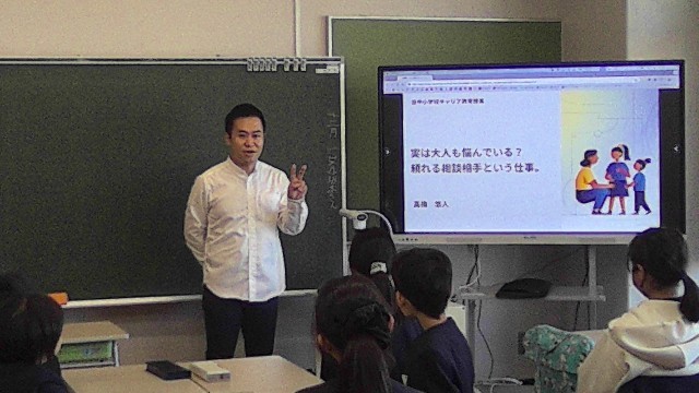 5年キャリア教育特別授業 公開日 2025/12/01 更新日 2025/12/01 今日の出来事 本日、ビジネスキャリアコーチの高橋先生をお招きしてキャリア教育特別授業を行いました。働く人の「相談相手」をされているだけあって、終始温かい雰囲気で子供達に語りかけてくださいました。子供達は将来について、仕事について考える貴重な機会になりました。