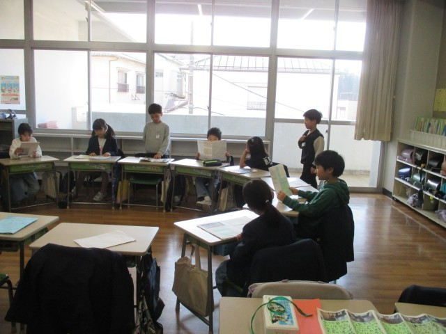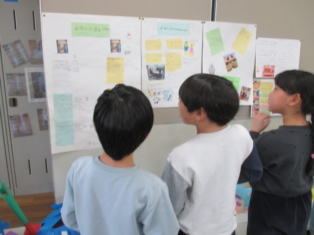 今日は、それぞれがまとめた作品をみんなで見合い、感想を伝え合う活動を行いました。