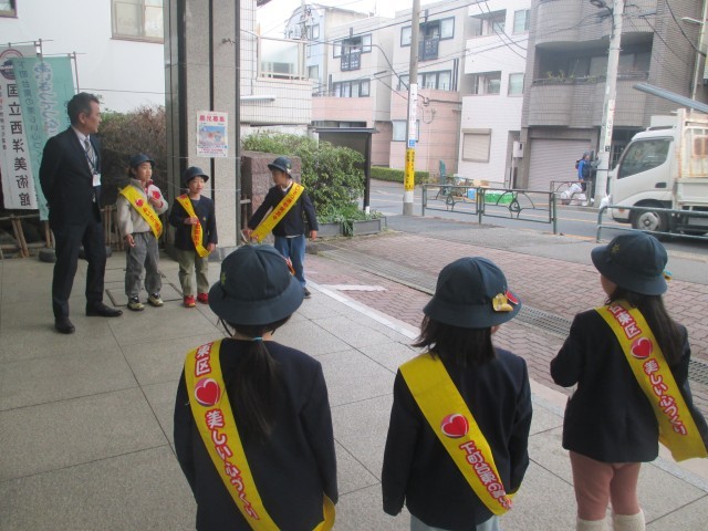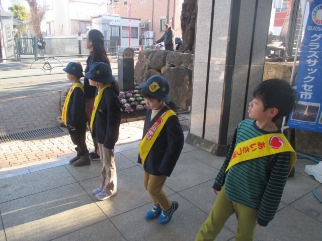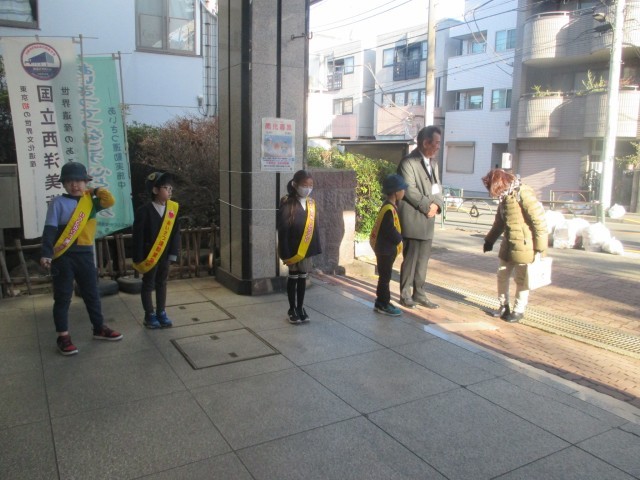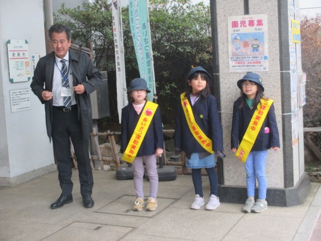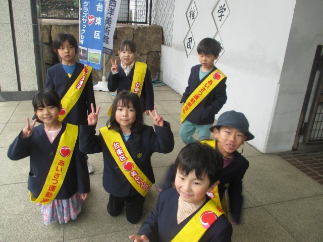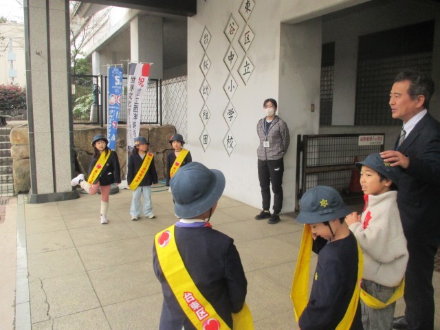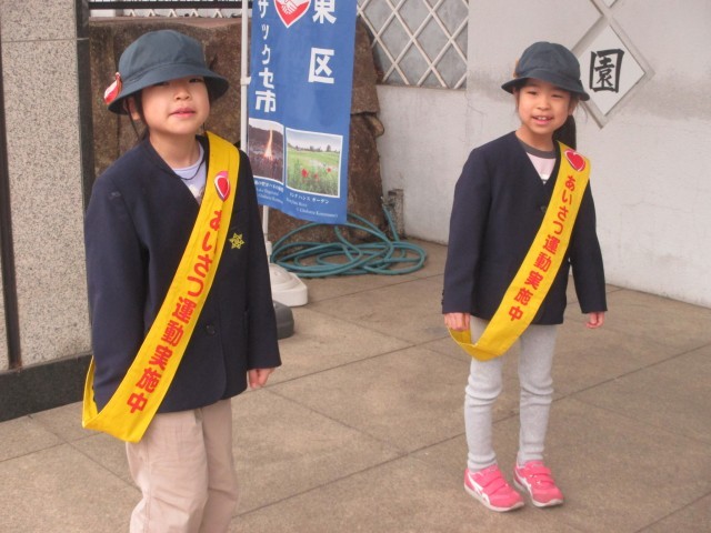 今週1年生は朝のあいさつ当番でした。