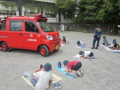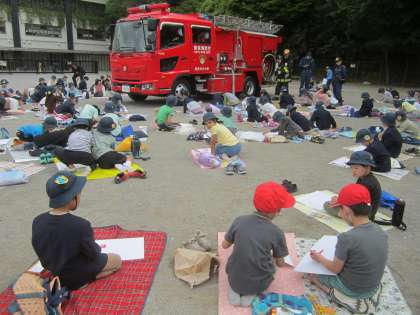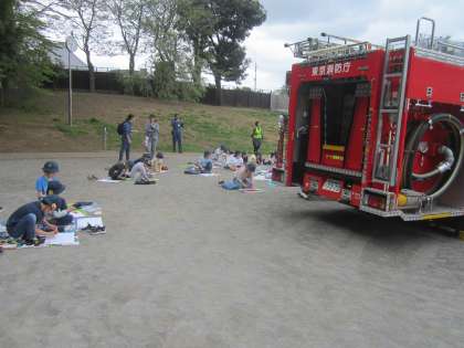 1・2年生 消防写生会 公開日 2024/04/22 更新日 2024/04/22 今日の出来事 4月17日(水)に消防写生会を行いました。 今年は天気もよく、消防署の方と消防団の方が来てくださいました。 「どの角度から書こうかな〜?」「消防士さんも一緒に描きたいな〜。」とウキウキしながら写生会にのぞみました。絵の具やクレヨンで仕上げをしていきます。出来上がった作品は6月15日(土)の学校公開で掲示します。ぜひ、ご覧ください。