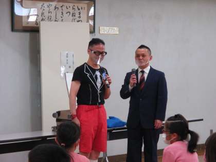 社会科では、「ごみの処理と利用」について学習しています。その学習と関連付けて、宮田陽、昇師匠をお迎えして環境漫才をしていただきました。