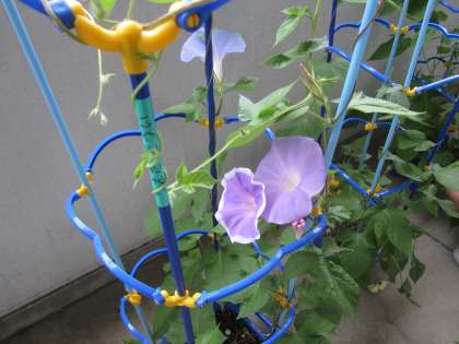 1学期の始めに植えた朝顔が、色とりどりに花を咲かせています。