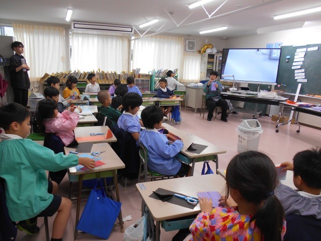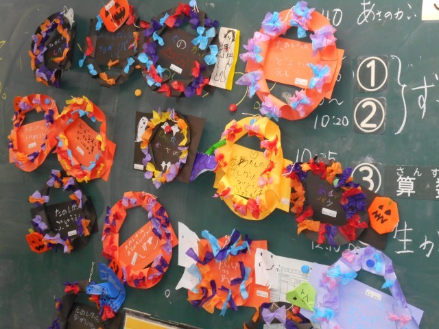 1年生が、図工の時間に、ハロウィンリースを作りました。