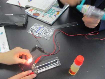 手回し発電機を使って、電気がどのようなエネルギーとして変化するのかを調べていました。子どもたちは、豆電球や液晶温度計につないだ手回し発電機を一生懸命回して、電気が明かりや熱として変化することを発見していました。