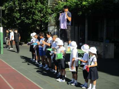 全校児童が校庭に集合し、代表児童がPTA会長さんからTシャツを受け取りました。Tシャツの色は学年のカラーを基本としています。このTシャツを着て、金曽木120FESに参加します。