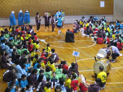 集会では、金曽木小学校の歴史にちなんだクイズをしたり、みんなで作ったお神輿を担いだりしました。最後にスペシャルゲストの「台東くん」も登場して会場を盛り上げてくれました。くす玉割では、みんなの心が一つになりました。