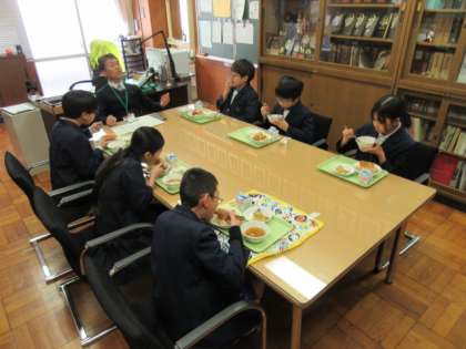 校長室で、卒業する6年生との会食を行っています。「6年間での1番の思い出」や「中学校で入りたい部活」「中学校でがんばりたいこと」などのインタビューをしながら会食しています。
