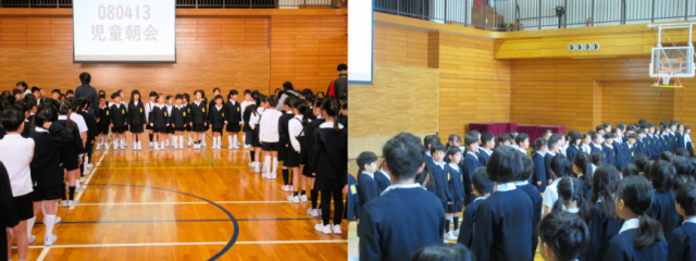 児童朝会の前に1年生との対面の会がありました。今日から全校児童がそろって朝会...